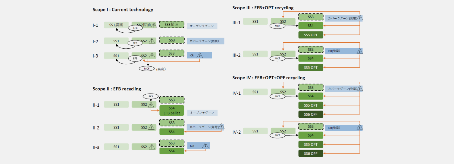 - パームバイオマスを積極的に再利用する場合A[パーム核シェル(PKS)、パーム空果房(EFB)、アブラヤシ幹(OPT)、アブラヤシ葉(OPF)を個別に再利用する場合]。